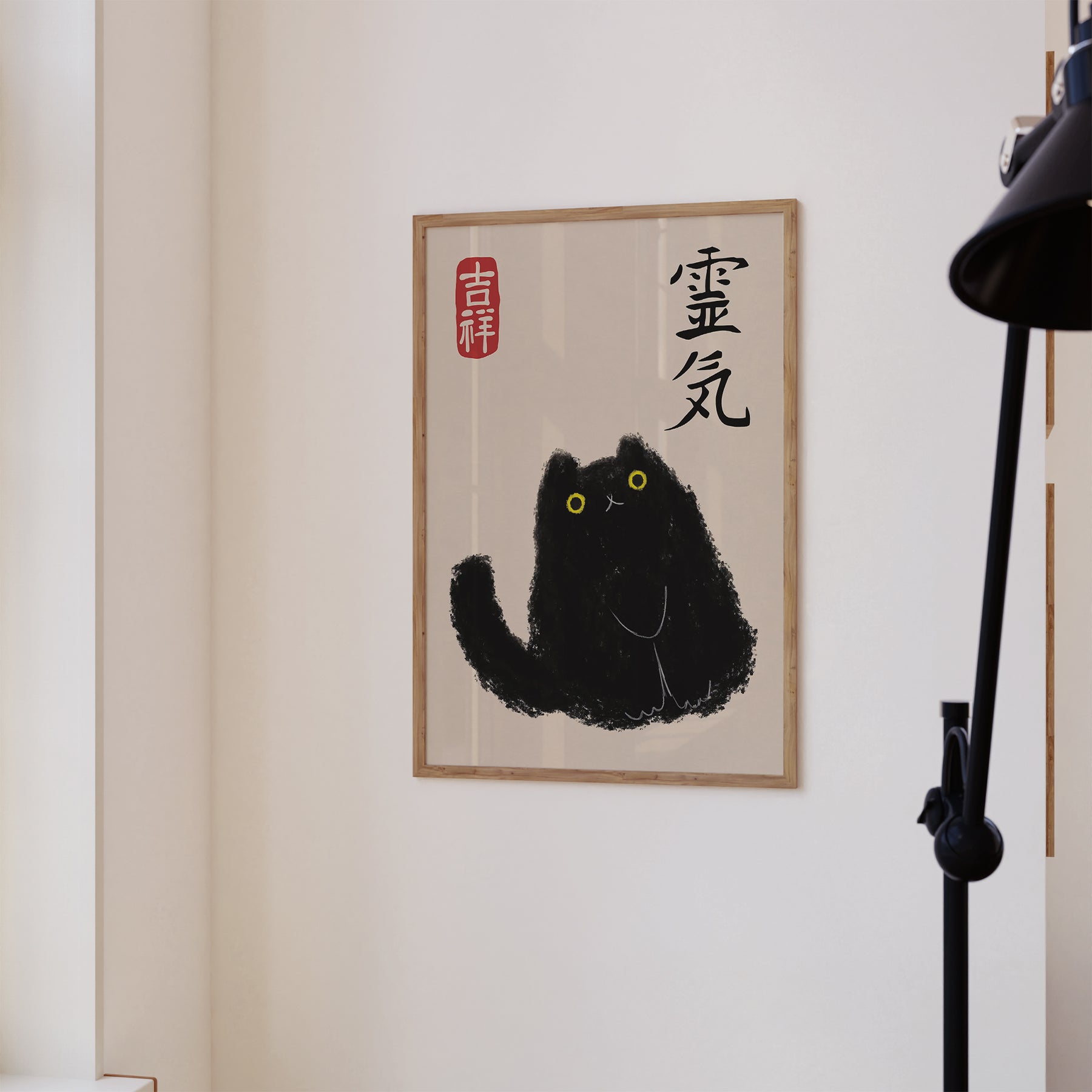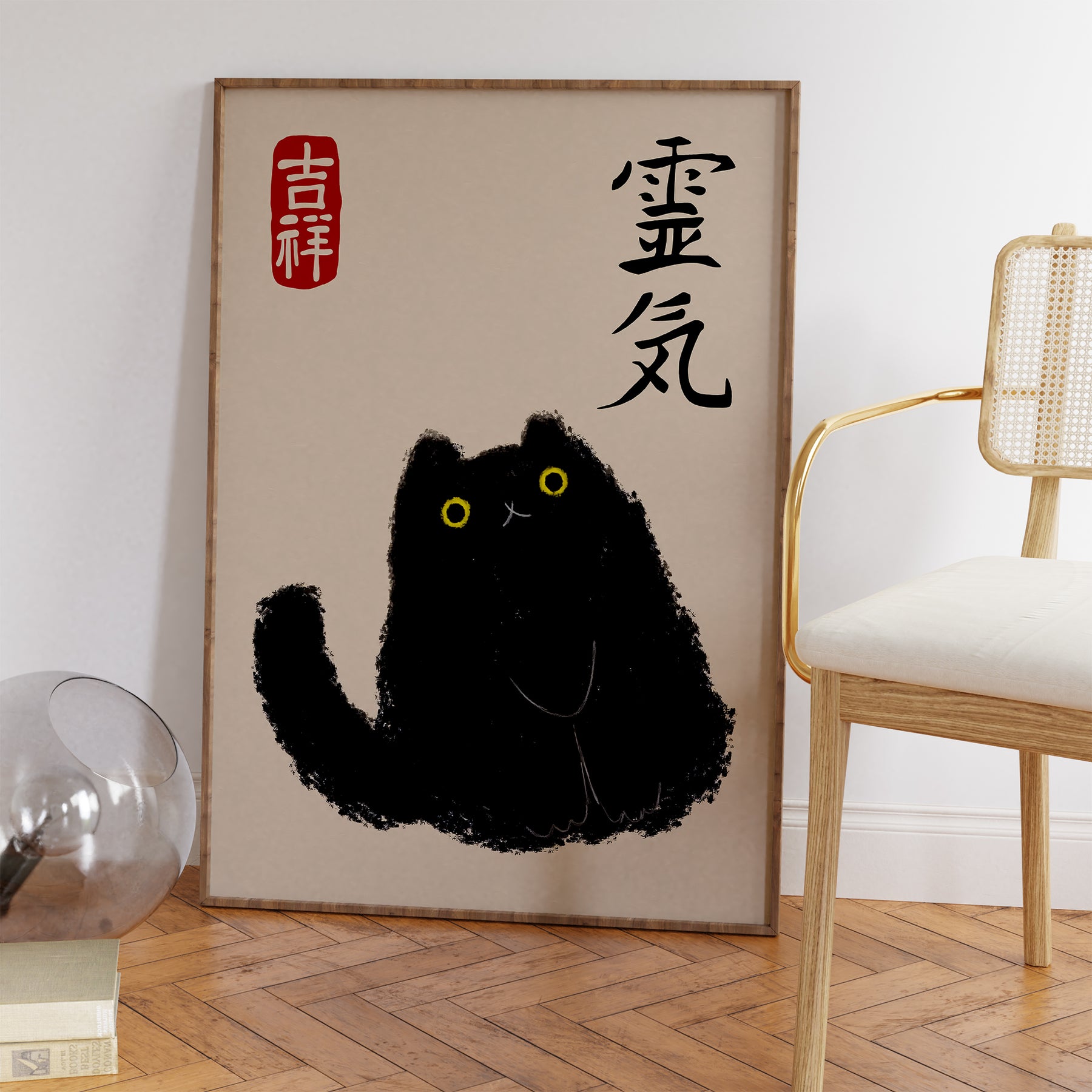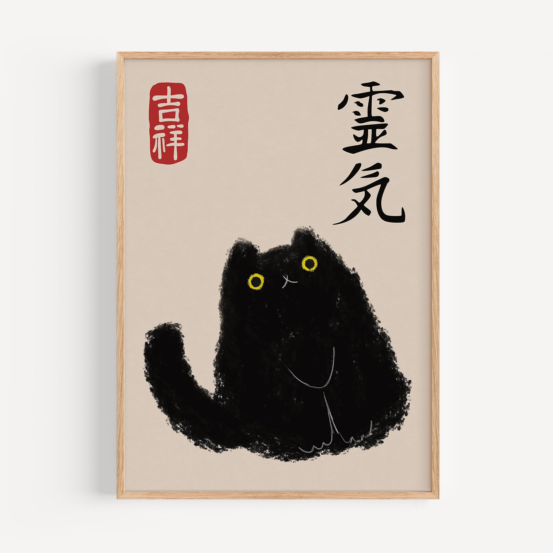 Embrace tranquility and a touch of playful mystique with our Zen Black Cat 'Reiki' art print. This minimalist yet expressive piece features a charming black cat with piercing yellow eyes, set against a calming neutral background. Adorned with delicate Japanese calligraphy, it evokes a sense of peace, balance, and good fortune, making it a perfect addition to any space seeking a harmonious aesthetic.