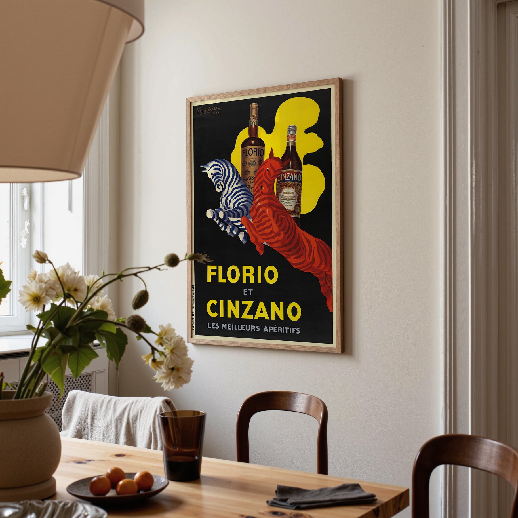 Step back into the vibrant, sophisticated world of 1930s Italy with this captivating Art Deco poster. Originally designed to advertise the classic aperitifs Florio and Cinzano, this print is a testament to the era's bold graphics and iconic style. The striking contrast of the black background with the vivid red and blue striped zebras (or perhaps stylized horses!) leaping across a splash of sunny yellow creates a dynamic and memorable visual that is sure to spark conversation.