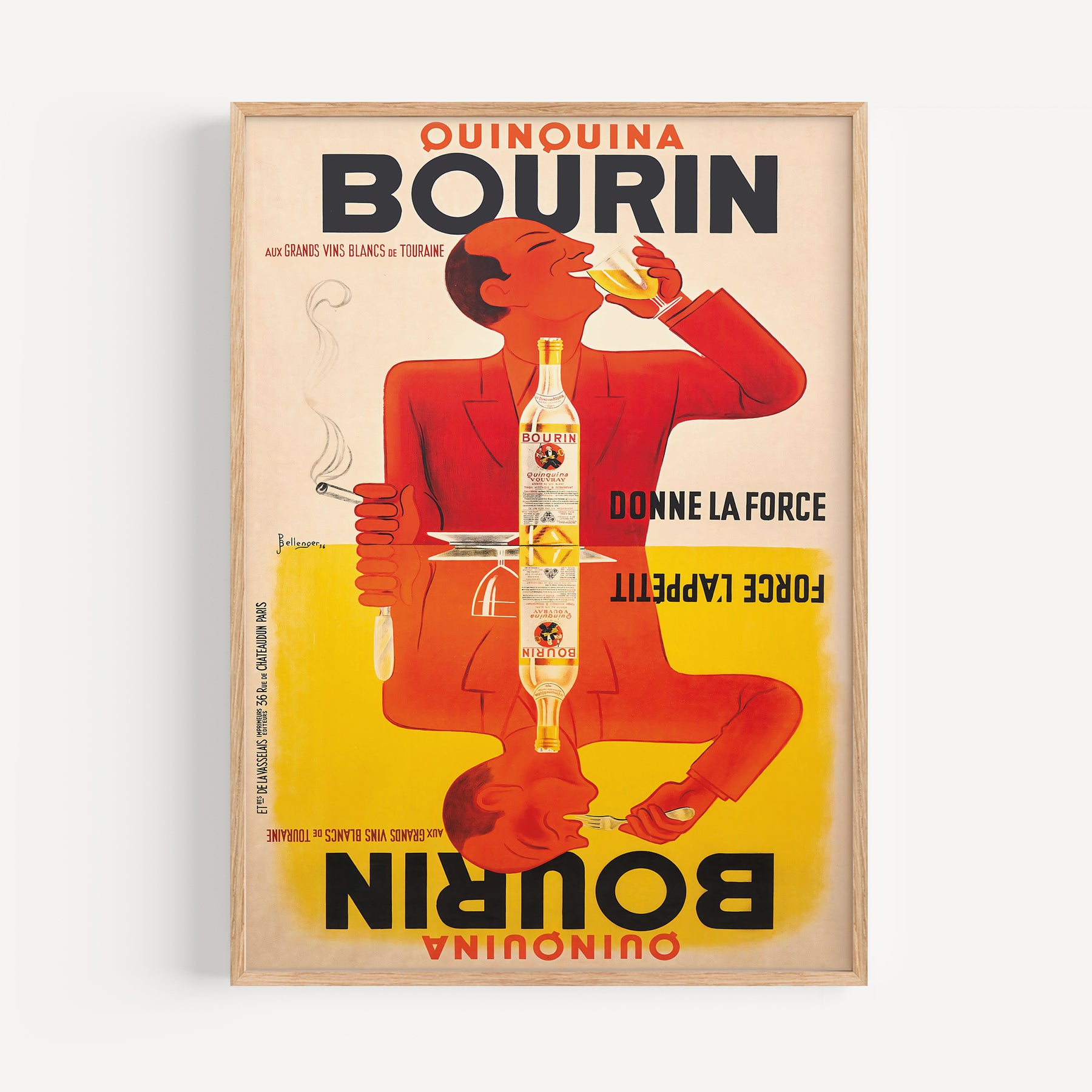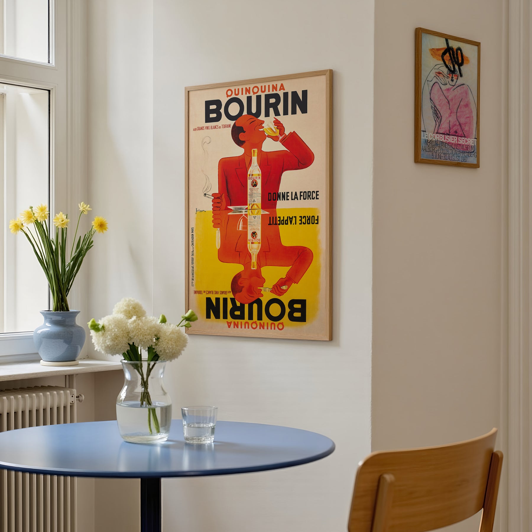 Transport yourself to the golden age of French advertising with this stunning Quinquina Bourin poster. Capturing the vibrant energy and bold aesthetic of early 20th-century design, this piece features a joyous figure enjoying a glass of aperitif, reflecting a time of elegance and indulgence. The striking color palette of warm reds, inviting yellows, and crisp black will infuse any space with a touch of retro charm and sophisticated allure.