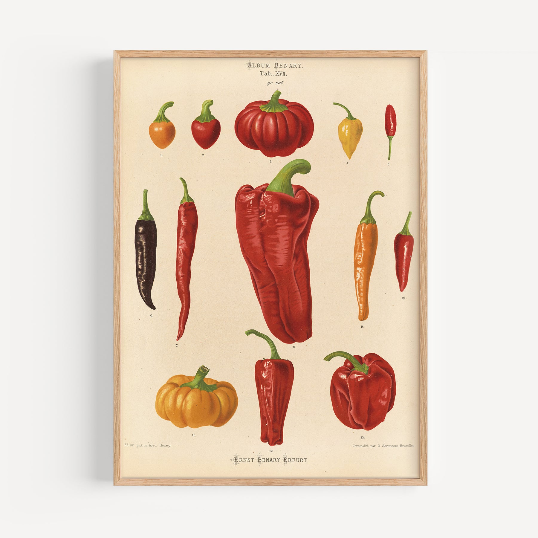 Bring the warmth and bounty of a heritage garden into your home with this exquisite botanical art print. Featuring a captivating study of various peppers and chilies, rendered in rich, vibrant hues of reds, oranges, and deep purples, this piece captures the intricate beauty and natural diversity of these beloved plants. The classic illustration style, reminiscent of vintage horticultural guides, adds a touch of timeless elegance and sophisticated charm to any space, perfect for food enthusiasts, gardeners, or anyone who appreciates botanical artistry.
