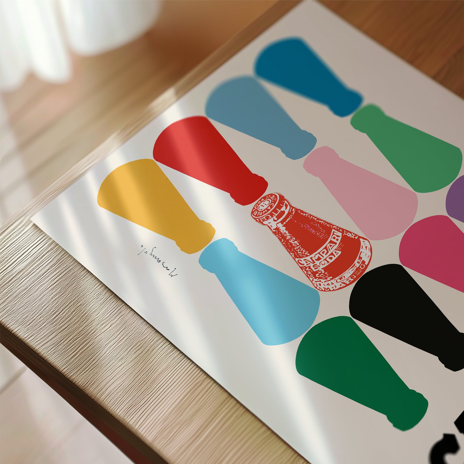 Infuse your space with a shot of vintage Italian zest with our 'Vibrant Campari Soda Pop Art Print'. Inspired by the iconic minimalist advertisements, this piece captures the playful spirit and bold aesthetics of classic mid-century design. The striking array of colorful, stylized bottles, punctuated by the unmistakable Campari Soda bottle, brings a lively, sophisticated energy to any room. It's more than just a print; it's a conversation starter, a nod to timeless design, and a splash of retro charm for your home or office.